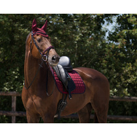 The QHP Florence Burgundy Saddle Pad is an elegant saddle pad with an anatomically shaped back and decorative twisted twin cord edging. The saddle pad is equipped with girth loops and short saddle loops with a Hook-and-loop fastener that ensure that the saddle pad stays in place. The QHP embroidery on the back completes the saddle pad.