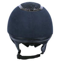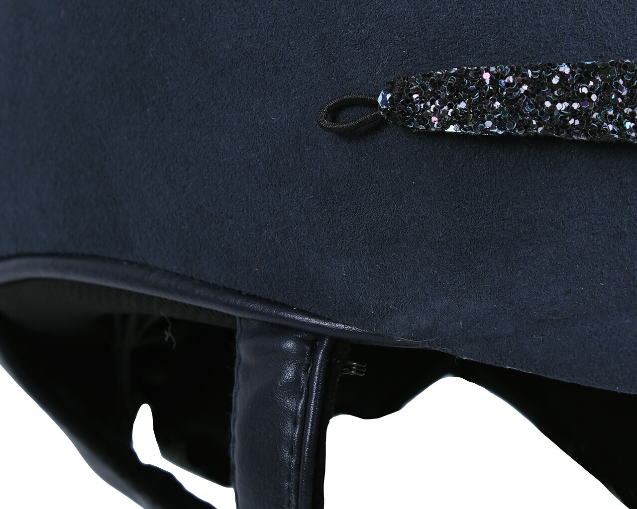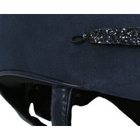 Striking safety helmet with suedine on the outside and a sparkly top. The look of the helmet can easily be changed by the detachable brim strap with glitter on the front. The strap can easily be removed with loops the straps can be placed back on small hooks on the helmet. The back vent on top gives the helmet a chic look and ensures comfort.
